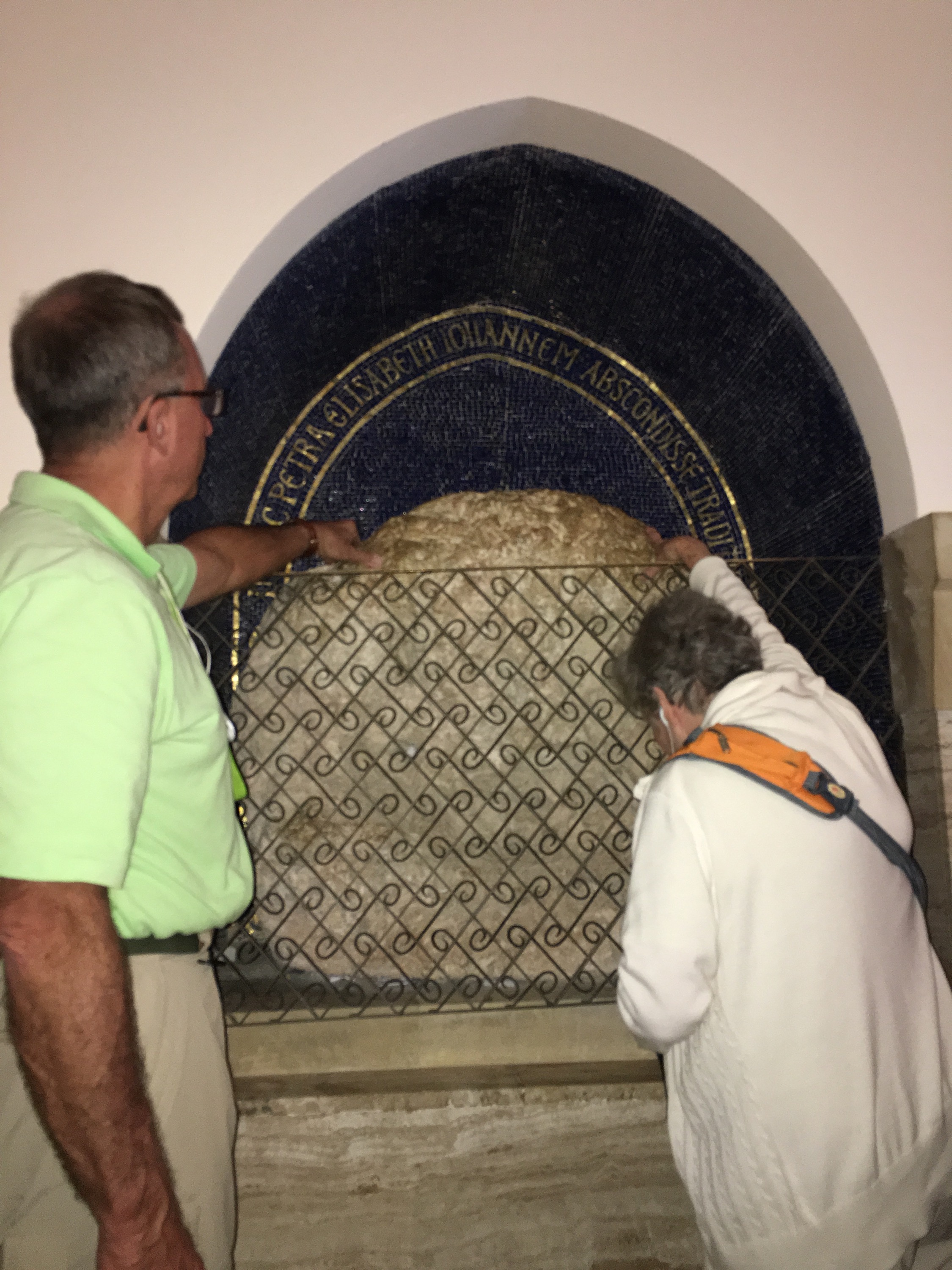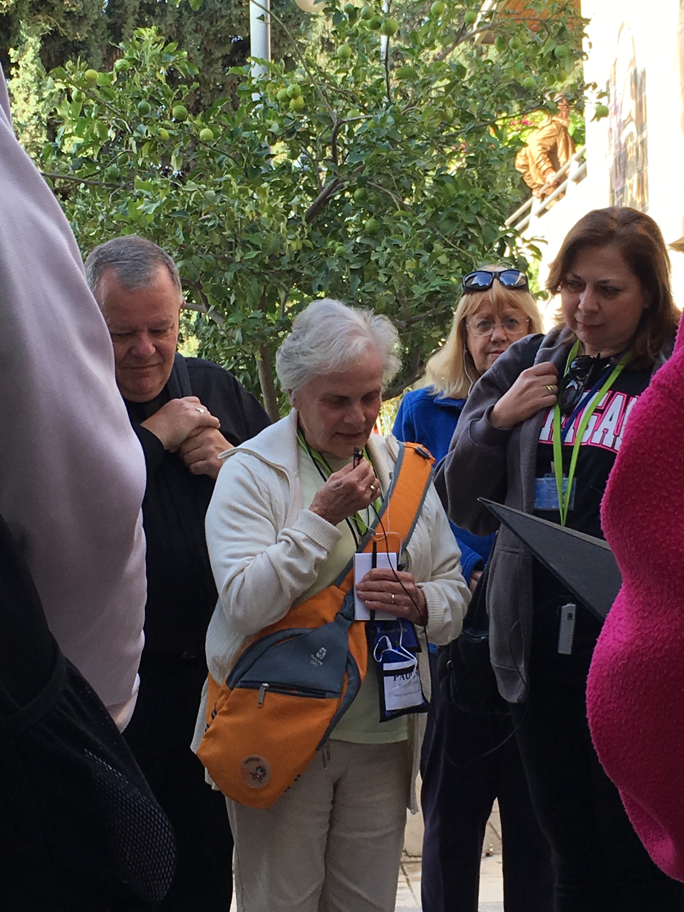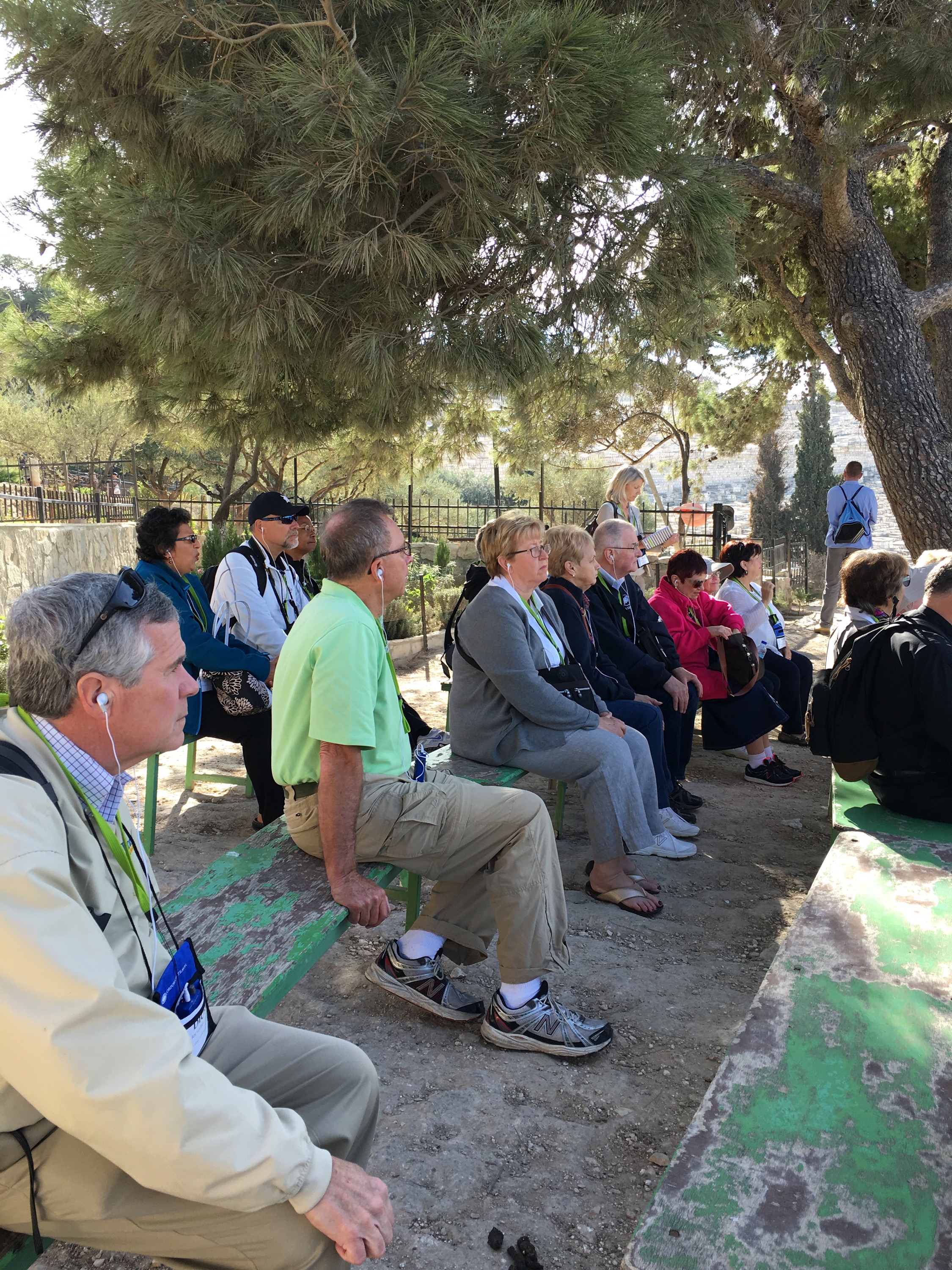 Then the blessed ‘Charioteers’ kicked in as we headed back through the cobblestone stepped paths of Old Jerusalem. Again, I can not thank my fellow pilgrims enough for stepping up to ‘carry the chariot’. It was another day of unbelievable amounts of steps through winding beautiful century old cobblestone paths-but certainly not ADA approved-:)!! They managed the bags (Thank you Kris, Molly and Ruth!) and offered prayerful ‘charioteer’ support from every corner. Their prayers were overwhelming to this humbled soul. Please meet the ‘Charioteers’…our fellow Pilgrims on a mission to make sure that yours truly could experience everything possible!! They even propped me up and held on to me for the picture on the steps to the Agony in the Garden at the Holy Sepulcher Church. I pray you can hear me applauding their unbelievable efforts!! Here are the selfless ‘Charioteers’!!